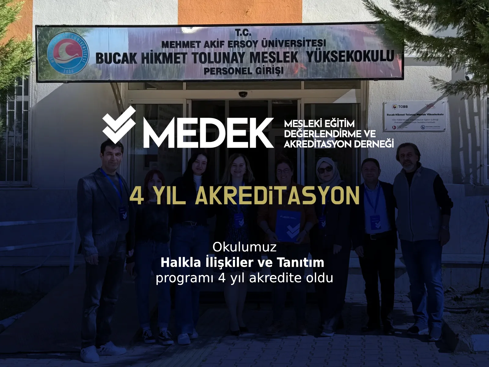 Bucak Hikmet Tolunay Meslek Yüksekokulu, akademik kalitesini ve eğitim standartlarını yükseltmeye yönelik çalışmalarına bir yenisini daha ekledi. Yüksekokulumuz bünyesinde yer alan Halkla İlişkiler ve Tanıtım Programı, Yükseköğretim Kalite Kurulu (YÖKAK) tarafından yetkilendirilmiş ulusal bir kuruluş olan Mesleki Eğitim Değerlendirme ve Akreditasyon Derneği (MEDEK) tarafından yapılan titiz değerlendirmeler sonucunda akredite edilmeye hak kazandı.