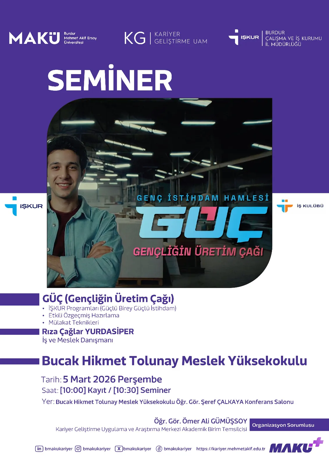 Kariyer Geliştirme Uygulama ve Araştırma Merkezi ve Burdur İŞKUR Müdürlüğü iş birliği ile düzenlenen Genç İstihdam Hamlesi GÜÇ Semineri, Meslek Yüksekokullarımızda öğrencilerimizle buluşuyor.